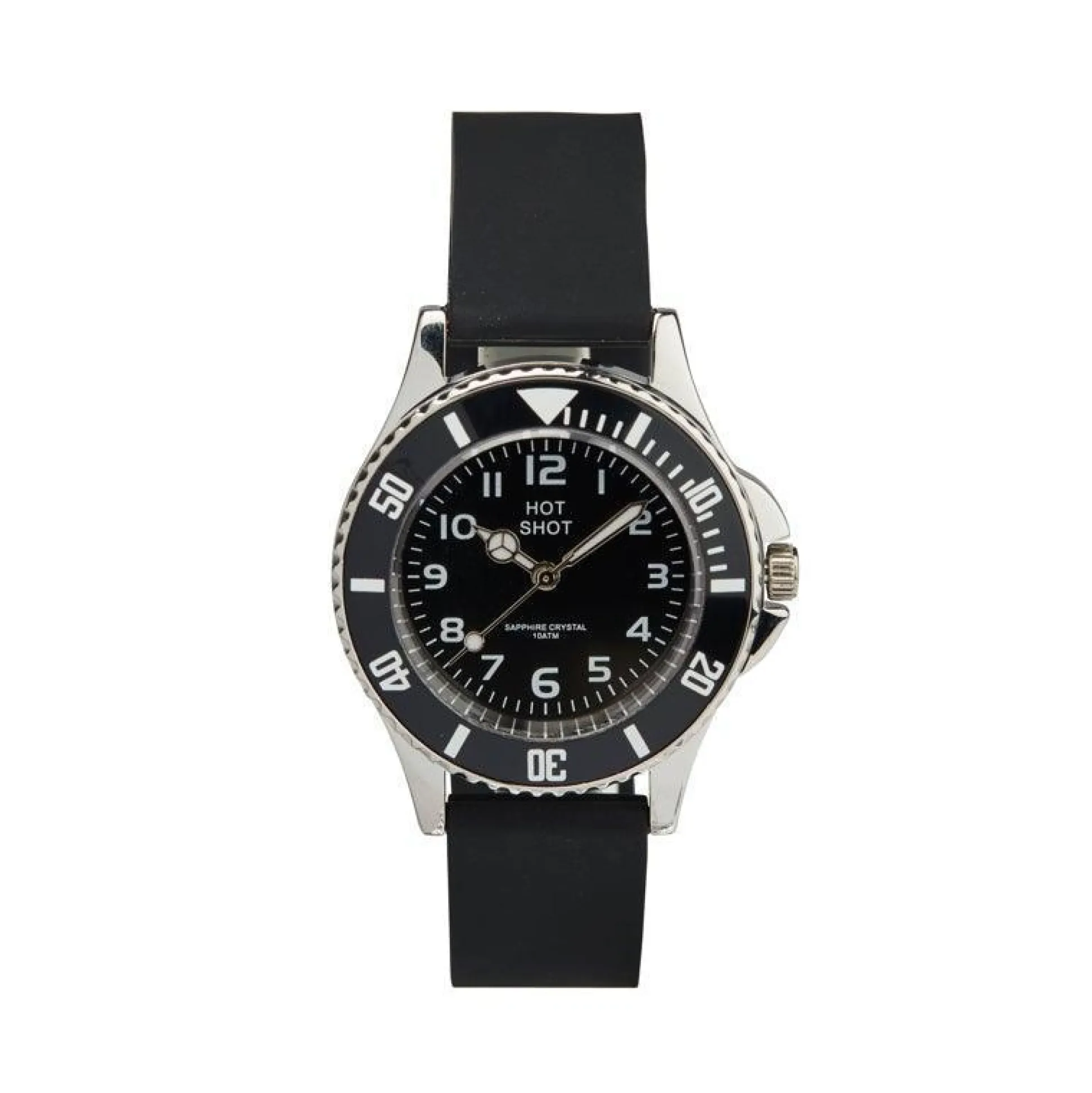 Hot Shot børneur med en sort silikonerem, sort urskive med gode tal markeringer og minut krans der kan dreje.