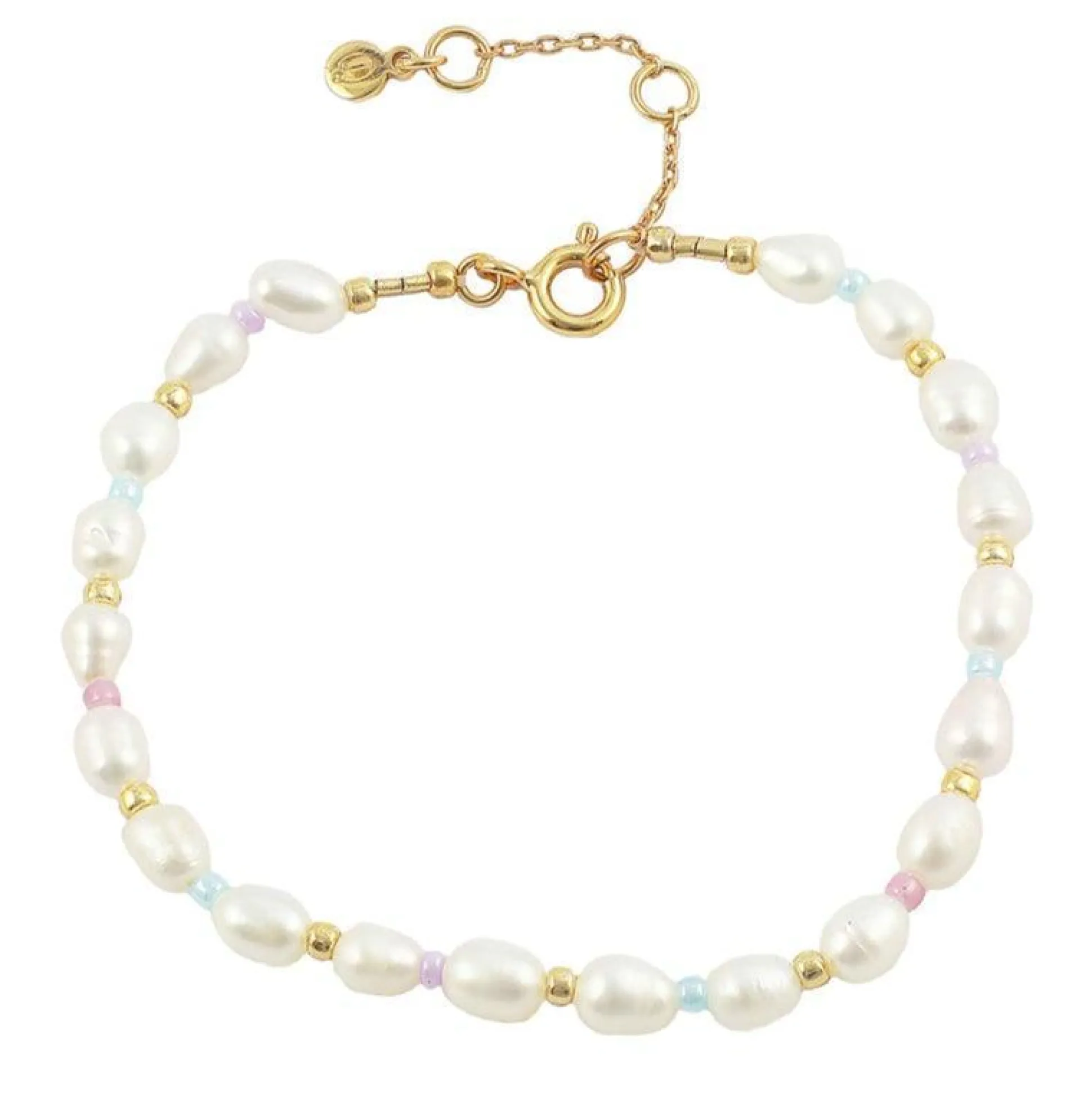 Sødt og feminint armbånd i forgyldt sølv med ferskvandsperler og pastel farver fra Hultquist Copenhagen.